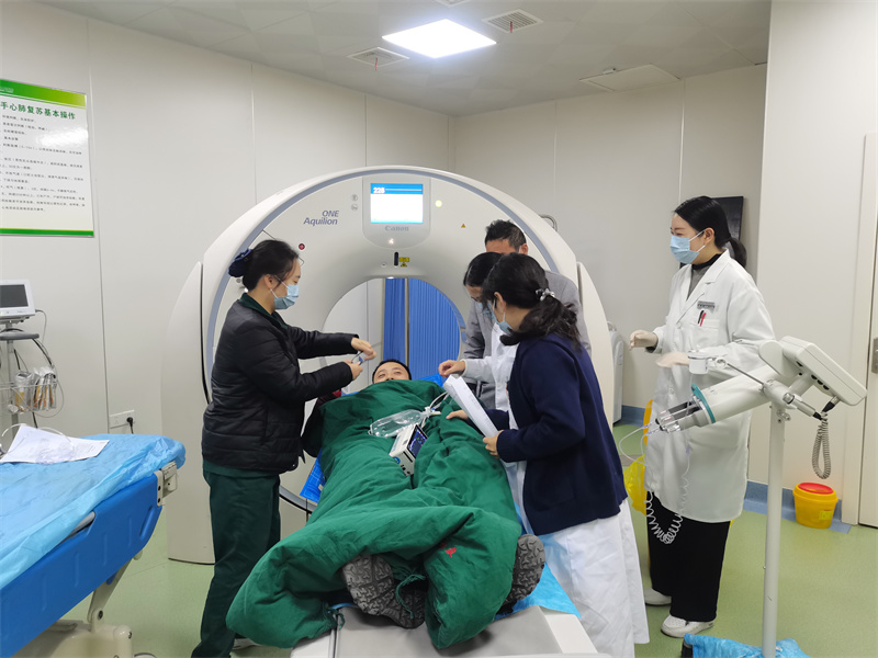 演练中,各环节衔接紧密、高效协同:急诊科护士 3分钟内完成患者分诊,启动绿色通道并建立静脉通道;10分钟时,患者被转运至CT室,影像科技师已提前待命,仅用8分钟就完成头颅CT平扫与头颈CTA+CTP检查,排除脑出血并锁定大血管闭塞位置;神经内科医生同步抵达,5分钟内完成NIHSS评分,与家属充分沟通后启动静脉溶栓;在溶栓进行的同时,取栓团队(介入手术室、麻醉科)同步响应,NICU 提前备好监护设备,神经外科做好外科干预准备 —— 整套流程环环相扣,完美践行 “患者未到、信息先到” 的预警机制,为实战中的生命救援积累了宝贵经验。