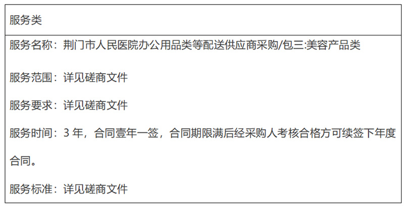 3、包名称 : 荆门市人民医院办公用品类等配送供应商采购/包三:美容产品类