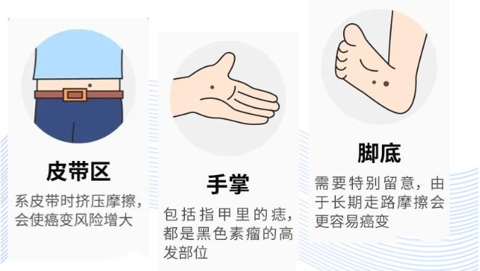 1、手掌或者脚掌等容易反复摩擦或刺激的部位,直径大于5mm。如果痣在换衣服时常被触碰到,或者你管不住自己的手,常会摸摸碰碰它,应尽早处理。