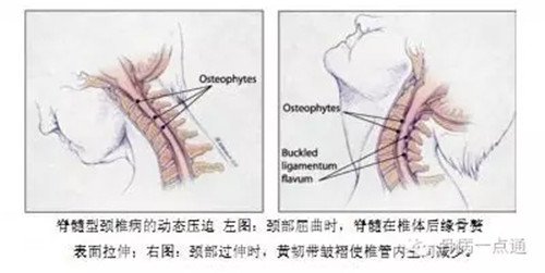 动态性因素主要是指颈椎的伸屈活动加重脊髓的应力、变形。颈椎伸展时,椎管长度缩短,脊髓松弛,脊髓组织变“短粗”,截面积增大,黄韧带自侧后方折入椎管,纤维环及被覆的后纵韧带后突,脊髓受压增加;颈椎屈曲时,椎管拉长,脊髓变扁、变宽,弓弦作用使其前移,椎管前方之骨赘和突出的椎间盘组织抵压脊髓,加重脊髓损害。颈椎后伸时,为上一椎体后下缘与下一椎节椎弓后部前上缘靠拢,产生对脊髓“钳压”作用,特别是在原有椎管狭窄的情况下,这种作用更加明显。