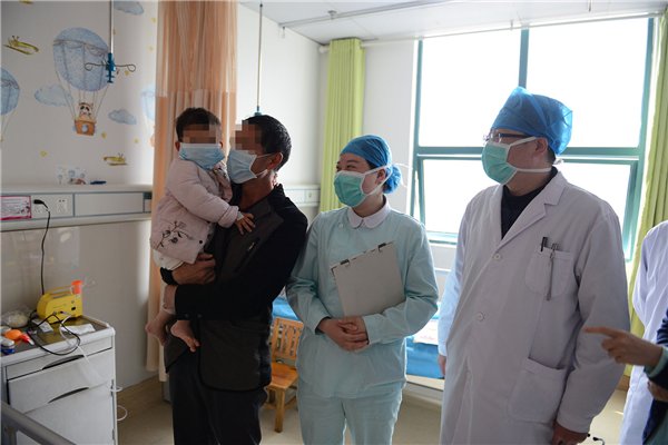儿科护士长王艳为小蕊戴好口罩,准备出院。