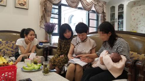 孙德蓉主任、佘小艳医生(左二)一行翻看评估血压及奶量记录