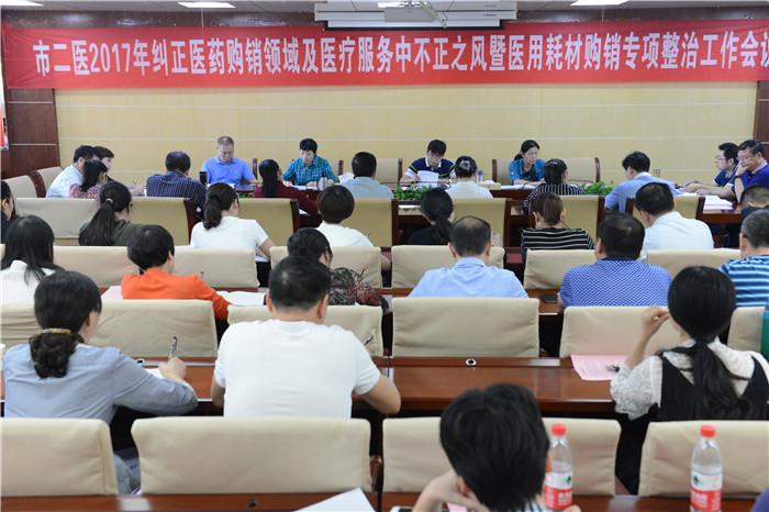 副院长万有才在会上宣读了《荆门二医2017年纠正医药购销和医疗服务中不正之风专项治理工作要点》、《荆门二医2017年医用耗材购销专项整治工作方案》。根据全省统一部署,结合省委巡视“回头看”问题整改工作、全市卫生计生重点工作专项治理、“5+4+1”专项治理,今年的纠医专项整治工作突出治理以下五个方面:一是加强医药采购管理,严格规范医药采购行为;二是着力整治药价虚高和临床不合理用药;三是着力控制医疗费用不合理增长;四是着力整治医疗服务违规收费;五是加强医德医风建设。