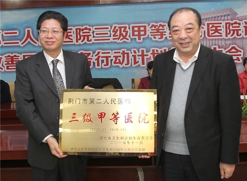 1、1月5日,省卫生计生委原党组书记杨有旺(右)将三甲医院匾牌授给时任荆门二医院长李成龙(左)。