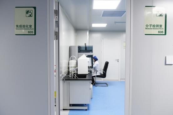 综合楼12楼分子生物实验室面积700m2, 配备ABI 3500二代测序平台、荧光定量PCR、丰华LC-MS/MS质谱平台、核酸提取仪和专设大规模核酸检测实验室,开展无创产前筛查、肿瘤耐药基因、肿瘤易感基因、单基因遗传病、病毒核酸定量检测等业务。