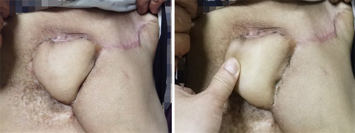 清创(皮下实际溃疡面8cm×7cm)、反复冲洗创面并扩创、部分拉拢缝合,左侧乳房上胸壁切取剩余创面大小、形状相同的“动脉穿支皮瓣”,再旋转后覆盖、缝合……因王女士贫血(术中输血),手术持续了3小时,术后经过两周的换药、人工皮覆盖、封闭负压引流——一次修复成功、皮瓣存活。