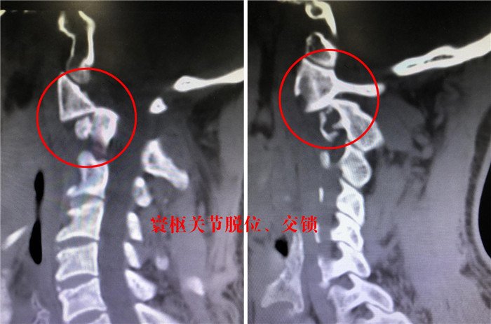 ▲寰枢关节脱位、交锁CT影像(红圈处)