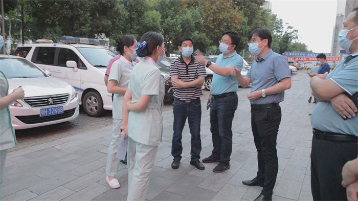 院党委书记张勇(左一)陪同市卫健委领导检查医院防控工作