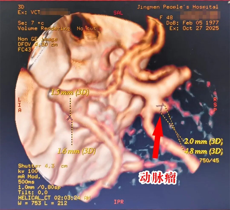 10月27日凌晨1时许,一声声呼救打破夜的沉寂……48岁的田女士(化名)被120急救车送到荆门市人民医院急诊科,她脸色苍白、神志模糊,双手紧紧抱着头。急诊医护一边询问病情——半小时前突发头晕、剧烈头痛、恶心呕吐,一边为她量血压——174/109m“查体高度怀疑脑血管问题!立即急查头颅CT。” 广泛蛛网膜下腔出血——最常见的病因就是颅内动脉瘤破裂。随后的头颈CTA(血管成像)提示右侧后交通动脉瘤、左侧后交通动脉瘤可能。