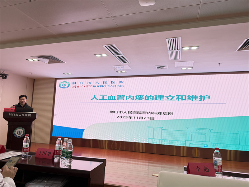 随后的人工血管内瘘规范化管理培训班上,郑启刚主任以《人工血管内瘘的建立与维护》为题,浅谈了人工血管内瘘的建立和AVG围术期的管理,分享了相关病例;荆门市人民医院肾内科副主任冯婷婷通过对人工血管内瘘相关知识的讲解,引出了人工血管内瘘管理上的难点,深入探讨了相关方案的可行性;荆门市人民医院血透中心护士长孙梦围绕人工血管内瘘的穿刺及维护技巧,详细阐述了相关要点及注意事项。
